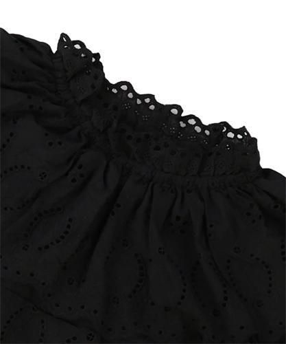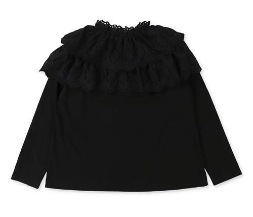 身頃はフワッとしたAラインシルエットで、襟元にカットワークレースをふんだんに使用しました。