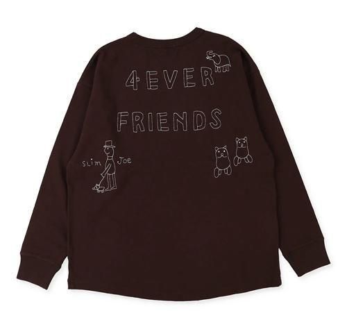 フロントにはインパクトのある「HEY」のフロッキープリント、バックには手描き風のイラストと「4EVER FRIENDS」のメッセージが入ったユニークな長袖Tシャツ。