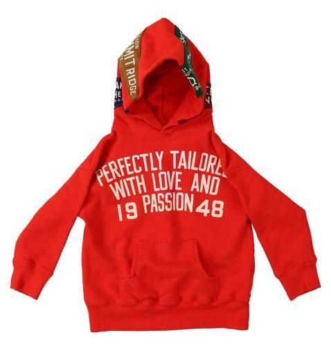 フードまわりにお気に入りのペナントを付けたリメイクパーカーです。