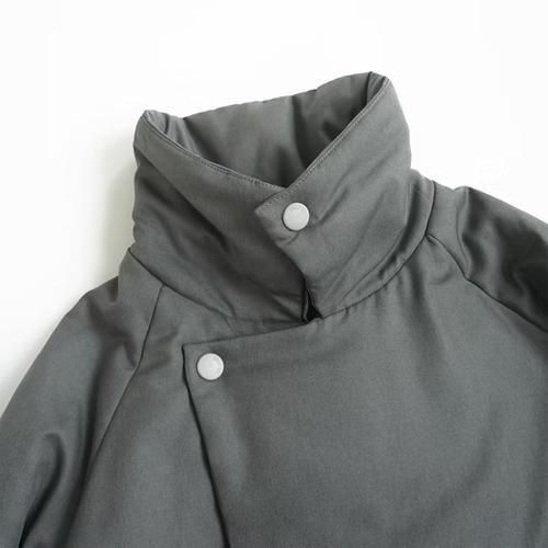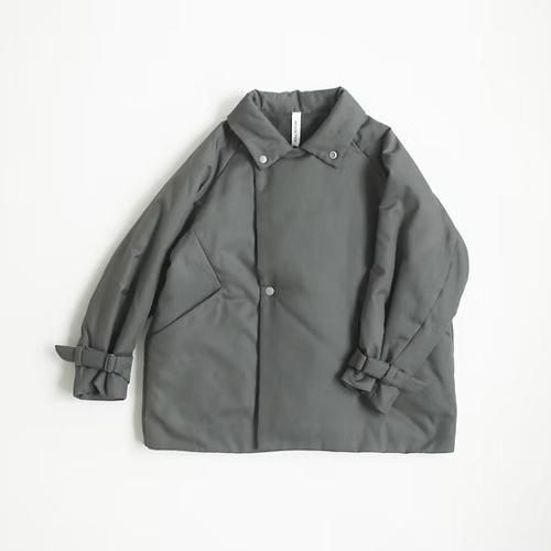 オーセンティックなダブル仕立てのハーフコートを、 ゆったりとしたシルエットと、ウールライクで軽量なポリエステル素材を使用し、 中綿入りにすることで、とても軽く暖かく、 フワッとしたボリューム感とリラックス感のある スタイリッシュな雰囲気になっています