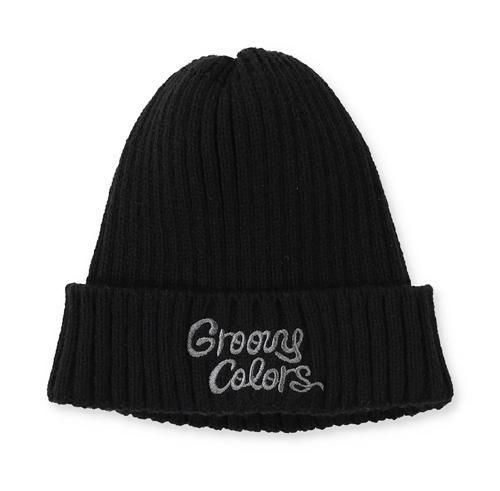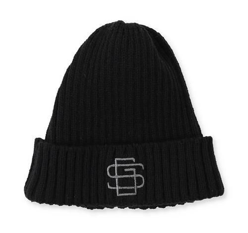 左側面にはブランドロゴを刺繍したニットキャップ。