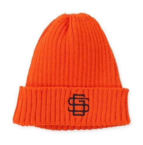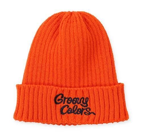 左側面にはブランドロゴを刺繍したニットキャップ。