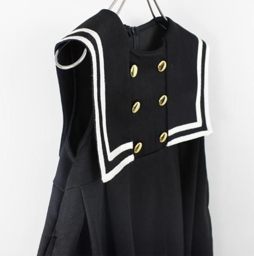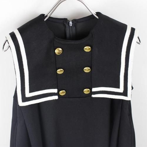 ゴールドのボタンがポイントのキレイ目なポンチ素材のセーラージャンパースカートです。