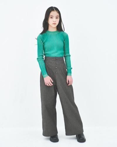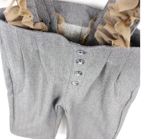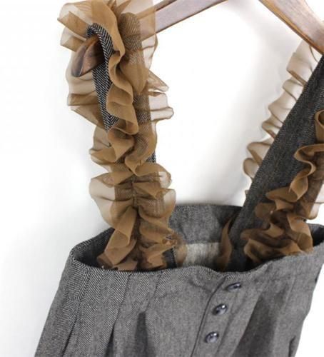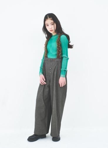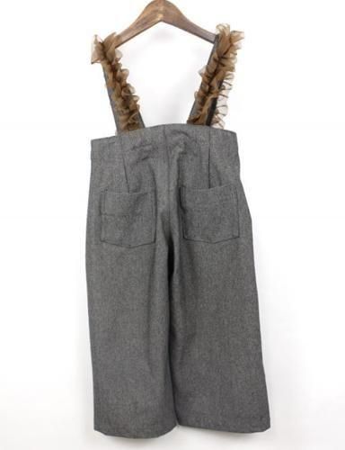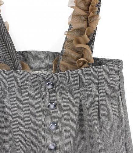 クラシックで上質なヘリンボンデニムにボリュームのあるチュールを施したサスペンダーが付いたワイドパンツです。