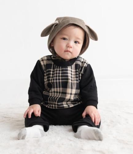 上品なモノトーンのタータンチェックでベビーセットをおつくりしました。